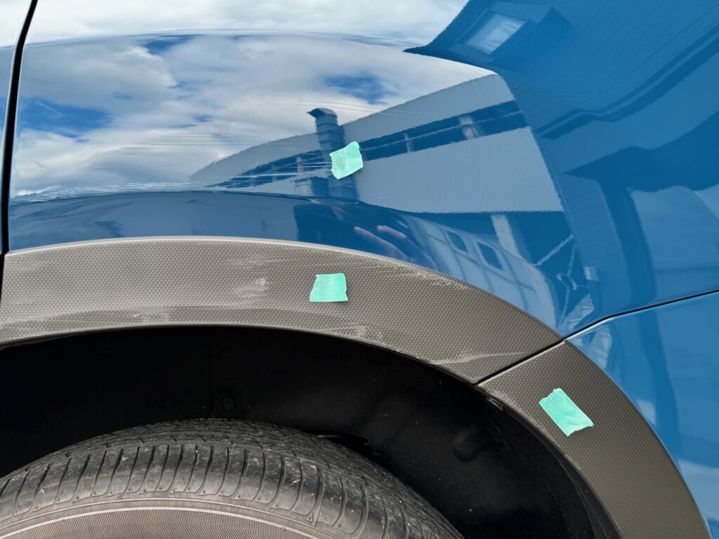 左リアフェンダー(後ろタイヤ上部のパネル)の凹みキズは鈑金、ボディリペアで修理していきます。