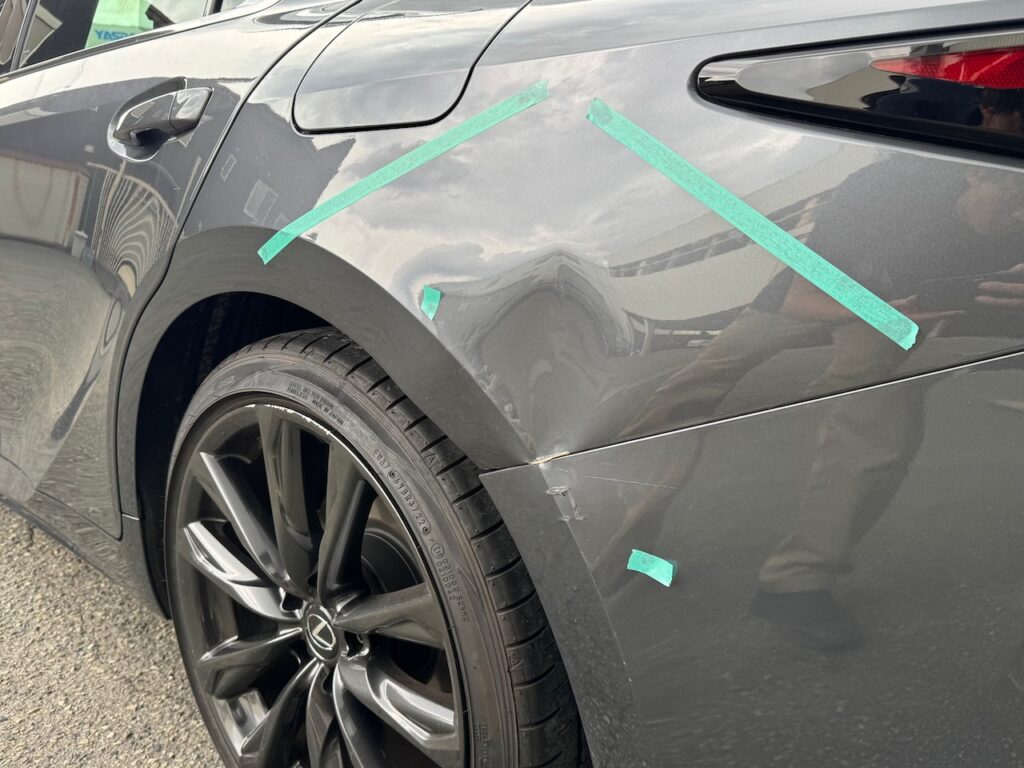 左リアフェンダー(後ろタイヤ上部のパネル)の凹みキズも鈑金、ボディリペアで修理していきます。